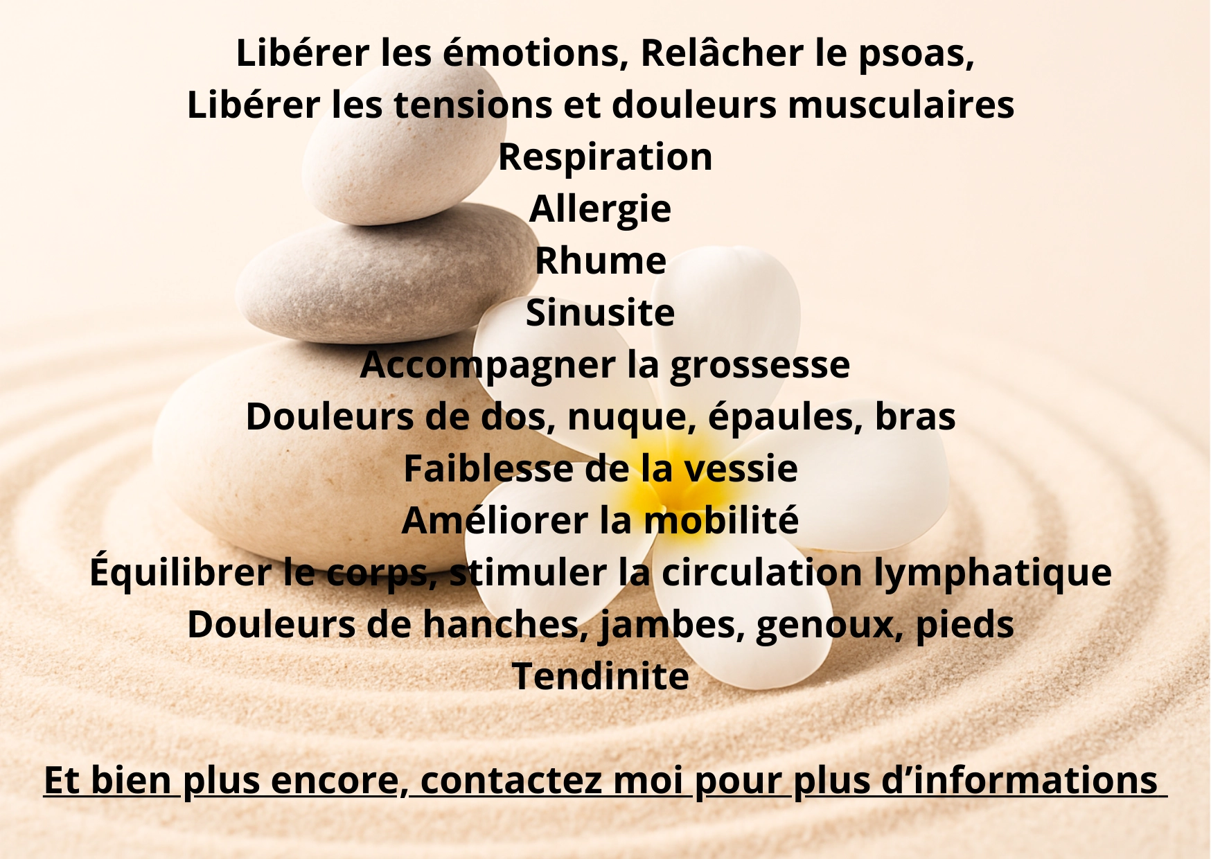 Mon objectif : vous offrir un moment de relâchement, rétablir l’équilibre dans votre corps et vous aider à retrouver un confort naturel au quotidien.